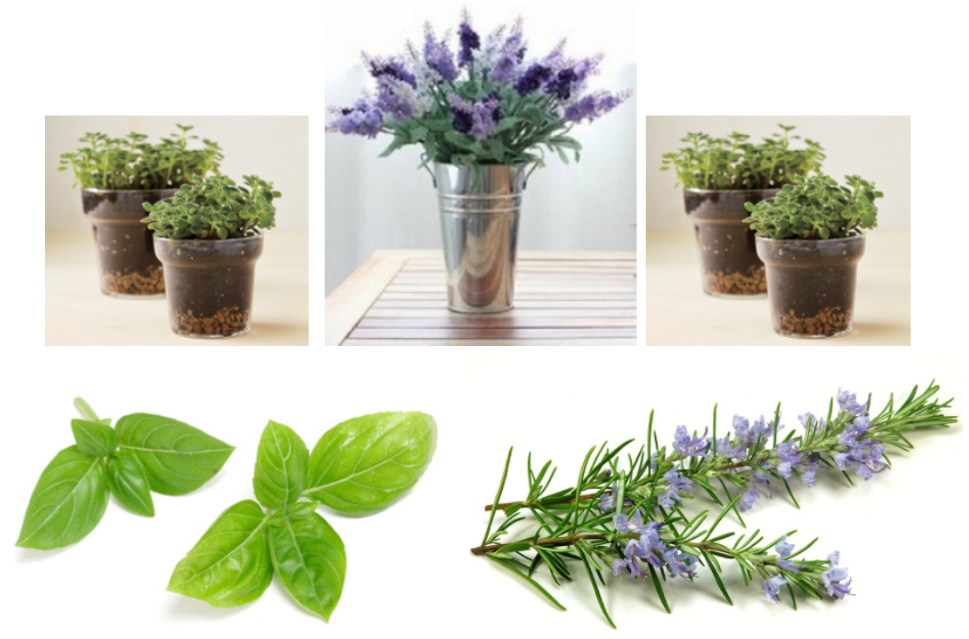 로즈마리, 민트 종류, 라벤더 (꽃), 세이지 종류, 펜넬 (씨앗), 딜, 말로우 (꽃), 캐모마일 (꽃), 히솝, 레몬그라 등